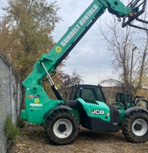 Factory Enclosed CAB w/ HEAT, JCB Turbo Diesel Engine, Foam Filled Tires, 4WD, Crab-Steering, Lift Hook, Frame Leveling, Auxiliary Hydraulics, Quick Tach, QC Carriage w/ Forks, Fleet Maintained