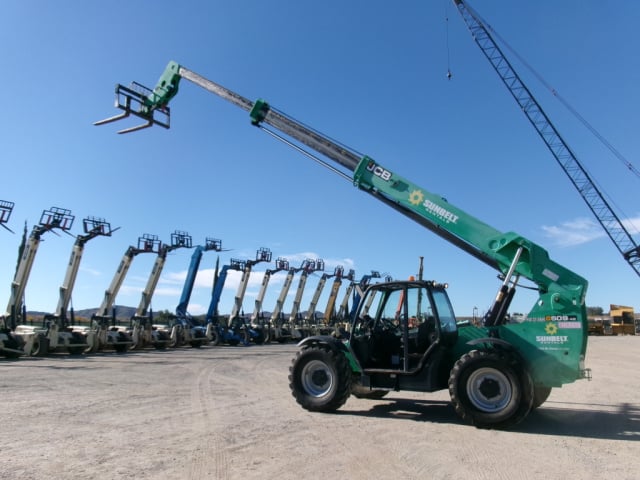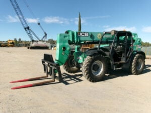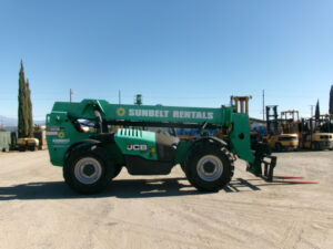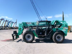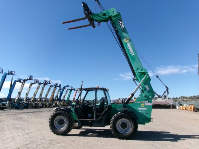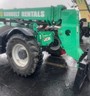 JCB Turbo Diesel Engine, Foam Filled Tires, 4WD, Crab-Steering, Fenders, Frame Leveling, Auxiliary Hydraulics, Quick Tach, QC Carriage w/ Forks, Fleet Maintained