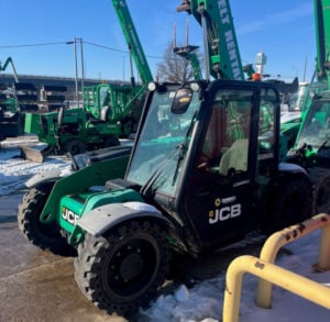 Factory Enclosed CAB w/ HEAT & AC, JCB Diesel Engine by Kohler – “No DEF” 74HP, Solid BOSS Tires, 4WD, Fenders, Auxiliary Hydraulics, Quick Tach, QC Carriage w/ Forks, Fleet Maintained