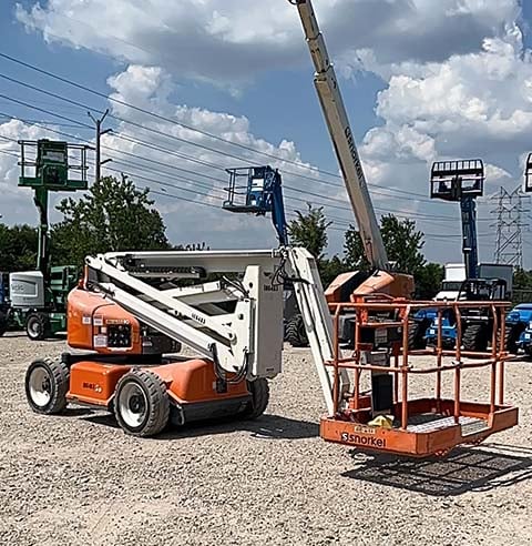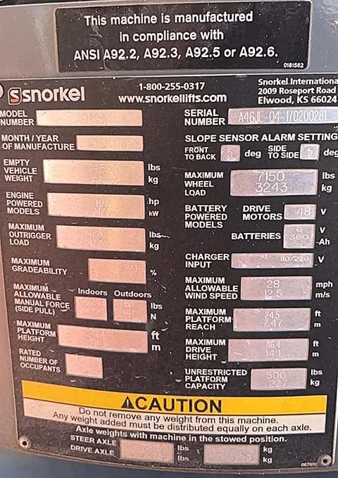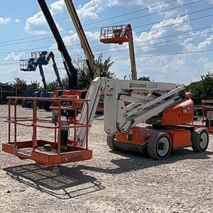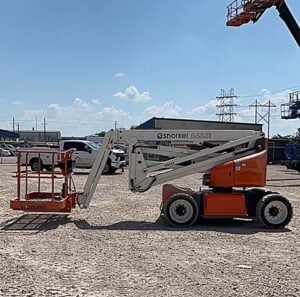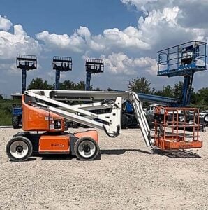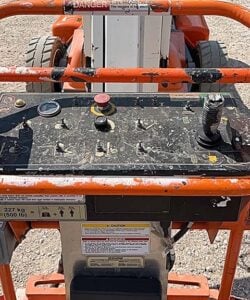 DC Electric Motor (Batteries), 2WD, White Solid Non-Marking Tires, 30% Gradeability, JIB, 6′ Platform, 500lbs Unrestricted Max Platform Capacity, Fleet Maintained, Weight 14638lbs