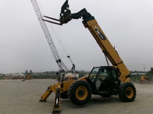 Outriggers/Stabilizers, CAT Turbo Diesel Engine, Pneumatic Tires, 4WD, Crab-Steering, Frame Leveling, Auxiliary Hydraulics, Quick Coupler, Hydraulic QC Carriage w/ Forks, FRESH Service (Fluids & Filters), CAT Fleet Maintained, Weighs 38125lbs
