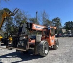 Factory Enclosed CAB w/ HEAT & AC, Outriggers/Stabilizers, Cummins Turbo Diesel Engine w/ Block Heater – “No DEF” 74HP, Non-Marking Foam Filled Tires, 4WD, Crab-Steering, Work Lights, Lift Shackle, Frame Leveling, Auxiliary Hydraulics, Quick Tach, QC Carriage w/ Forks, Fleet Maintained, Weighs 31,500lbs