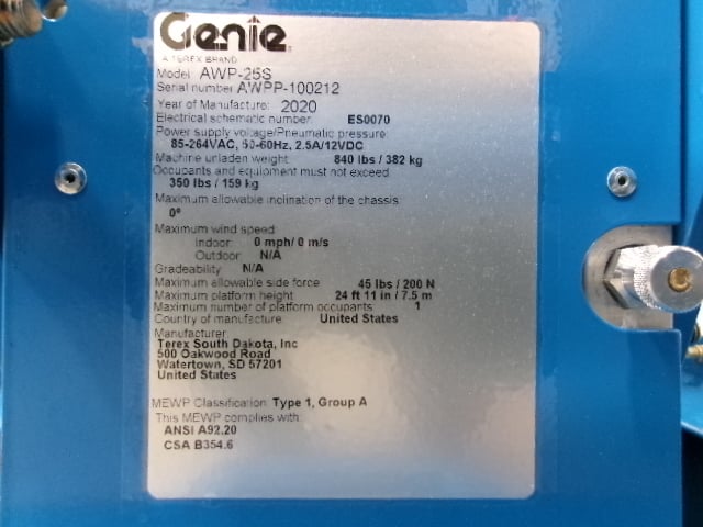 2020 GENIE AWP-25S – Aerial Work Platform – Push Around Vertical Mast Lift