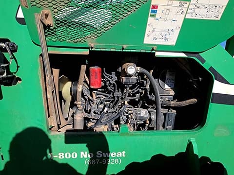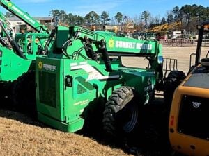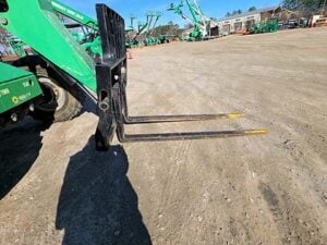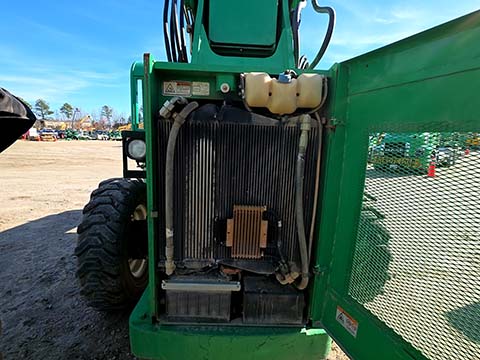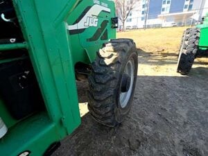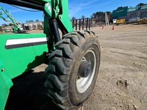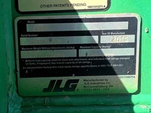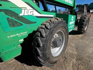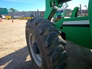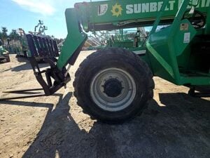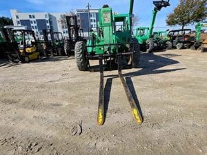 Cummins Turbo Diesel Engine – 85HP, Foam Filled Tires, 4WD, Crab-Steering, Frame Leveling, Auxiliary Hydraulics, Quick Tach, QC Carriage w/ Forks, Fleet Maintained, weighs 23487lbs