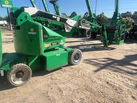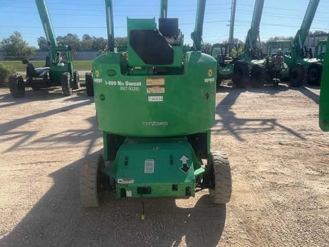 DC Electric Motor (Batteries), 2WD, Solid Non-Marking Tires, 30% Gradeability, 180 Degree JIB-PLUS, 4′ Platform, 500lbs Unrestricted Max Platform Capacity, Fleet Maintained