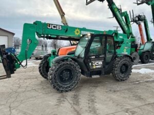 Factory Enclosed CAB w/ HEAT, JCB Turbo Diesel Engine, 4WD, Solid BOSS Tires, Crab-Steering, Fenders, Frame Leveling, Auxiliary Hydraulics, Quick Tach, QC Side-Tilting Carriage w/ Forks, Fleet Maintained