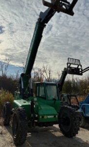 Factory Enclosed CAB w/ HEAT, Cummins Turbo Diesel Engine – “No DEF” 74HP, Foam Filled Tires, 4WD, Crab-Steering, Frame Leveling, Auxiliary Hydraulics, Quick Tach, QC Carriage w/ Forks, Fleet Maintained