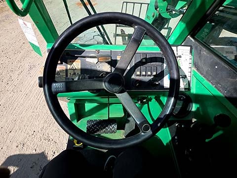 Factory Enclosed CAB w/ HEAT, Cummins Turbo Diesel Engine – 85HP, Foam Filled Tires, 4WD, Crab-Steering, Frame Leveling, Auxiliary Hydraulics, Quick Tach, QC Carriage w/ Forks, Fleet Maintained