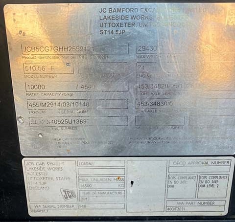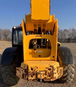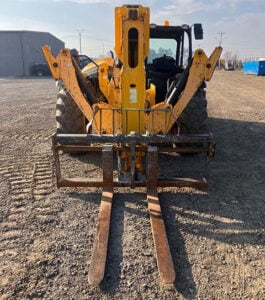 Outriggers/Stabilizers, JCB Turbo Diesel Engine – “No DEF” 74HP, Foam Filled Tires, 4WD, Crab-Steering, Fenders, Frame Leveling, Auxiliary Hydraulics, Quick Tach, QC Carriage w/ Forks, Fleet Maintained, Weighs 29430lbs