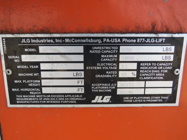 40’ Platform Height / 46’ Work Height / 34’ Horizontal Reach / 1000lbs Max Platform Capacity