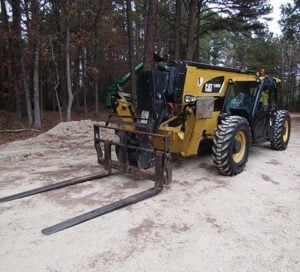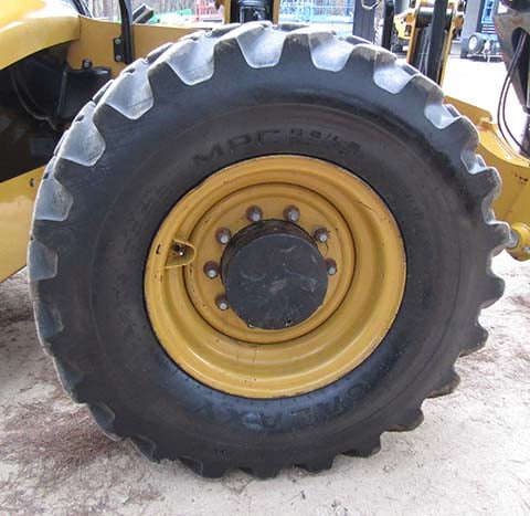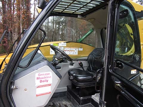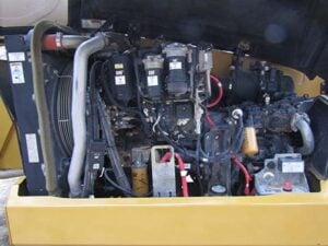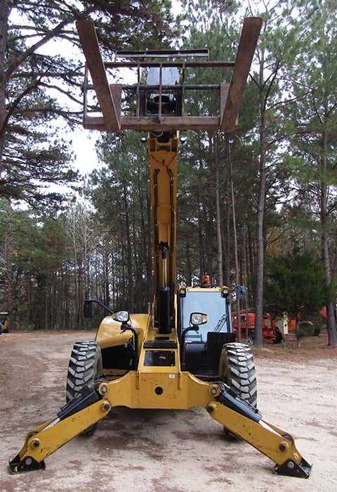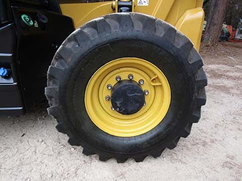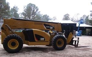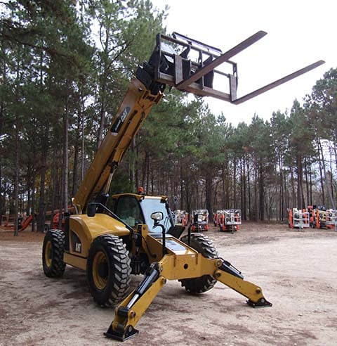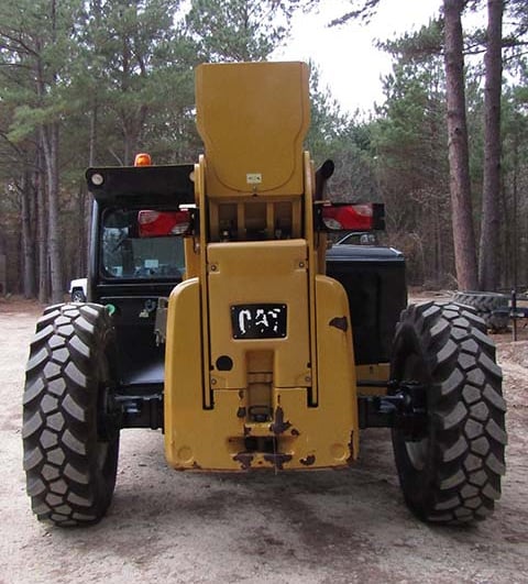 Factory Enclosed CAB w/ HEAT & AC, Outriggers/Stabilizers, CAT Turbo Diesel Engine – 142HP, Foam Filled Tires (2x NEW Rears & 90% Fronts), 4WD, Crab-Steering, Frame Leveling, Auxiliary Hydraulics, Quick Tach, Quick Coupler Carriage w/ Forks, Fleet Maintained, Weighs 37555lbs