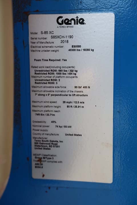 Home – Products – Telescopic Boom Lifts – 2018 GENIE S-85 XC “Xtra Capacity” – Used Telescopic Boom Lift