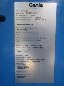 DC Electric Motor (Battery), 4WD, Non-Marking Foam Filled Tires, 30% Gradeability, JIB, 6′ Dual Entry Platform, 500lbs Unrestricted Max Platform Capacity, Fleet Maintained, Weighs 16192lbs