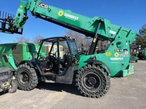 Outriggers/Stabilizers, JCB Turbo Diesel Engine, Solid BOSS Tires, 4WD, Crab-Steering, Fenders, Work Lights, Lift Hook, Frame Leveling, Auxiliary Hydraulics, Quick Tach, QC Side-Tilting Carriage w/ Forks, Fleet Maintained, Weighs 31345lbs