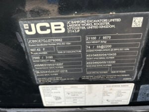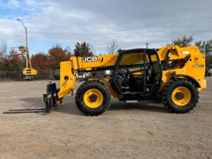 JCB Turbo Diesel Engine – “No DEF” 74HP, 4WD, Foam Filled Tires, Crab-Steering, Fenders, Lift Hook, Frame Leveling, Auxiliary Hydraulics, Quick Tach, QC 72″ Carriage w/ Forks, Serviced @ 1845 Hours, Fleet Maintained, Weighs 21100lbs