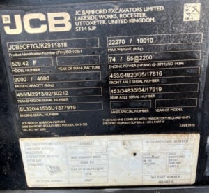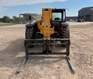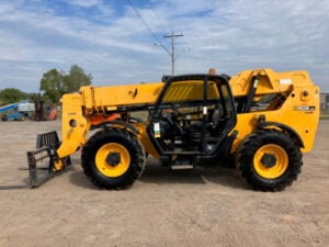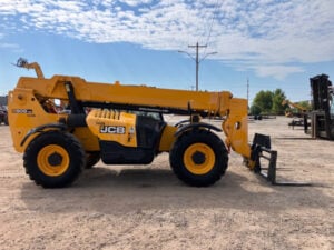 JCB Turbo Diesel Engine – “No DEF” 74HP, 4WD, Foam Filled Tires, Crab-Steering, Fenders, Work Lights, Flashing Beacon, Lift Hook, Frame Leveling, Auxiliary Hydraulics, Quick Tach, QC 72″ Carriage w/ Forks, Fleet Maintained, Weighs 22270lbs
