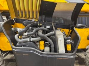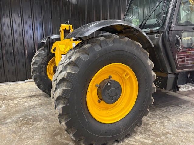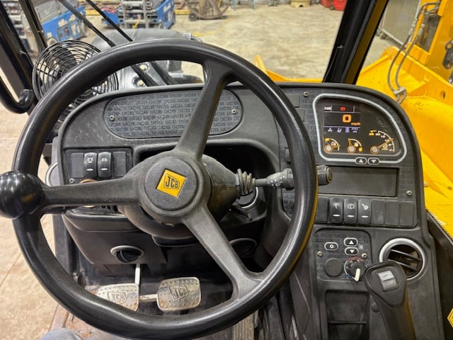 Factory Enclosed CAB w/ HEAT & AC, JCB Turbo Diesel Engine w/ Block Heater – “No DEF” 74HP, Foam Filled Tires, 4WD, Crab-Steering, Lift Hook, Fenders, Frame Leveling, Auxiliary Hydraulics, Quick Tach, QC Carriage w/ Forks, Fleet Maintained, Weighs 22270lbs