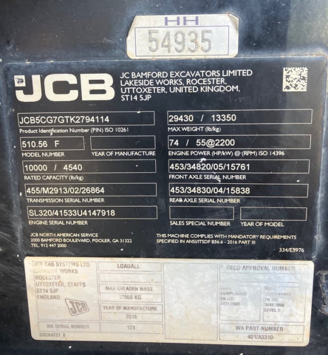 Outriggers/Stabilizers, JCB Turbo Diesel Engine w/ Block Heater – “No DEF” 74HP, Foam Filled Tires, 4WD, Crab-Steering, Fenders, Work Lights, Lift Hook, Frame Leveling, Auxiliary Hydraulics, Quick Tach, QC 72″ Carriage w/ Forks, Fleet Maintained, Weighs 29430lbs