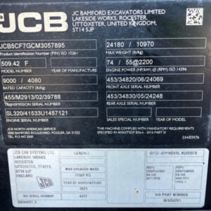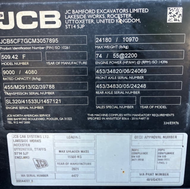 JCB Turbo Diesel Engine – “No DEF” 74HP 4WD, Solid BOSS Tires, Crab-Steering, Fenders, Work Lights, Lift Hook, Frame Leveling, Auxiliary Hydraulics, Quick Tach, QC 72″ Carriage w/ Forks, Fleet Maintained, Weighs 24180lbs