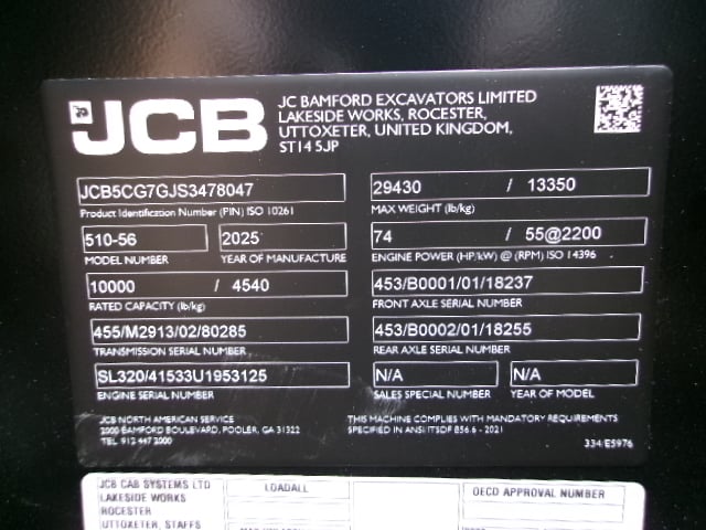Factory Enclosed Cab w/ Heat & AC, Outriggers/Stabilizers, JCB Turbo Diesel Engine w/ Block Heater – “No DEF” 74HP, Foam Filled Tires, 4WD, Crab-Steering, Fenders, Work Lights, Amber Beacon, Lift Hook, Rear Camera Kit, Frame Leveling, Auxiliary Hydraulics, Quick Tach, QC Carriage w/ Forks, Weighs 29430lbs