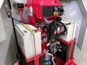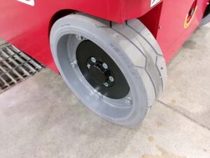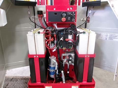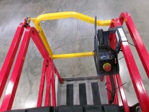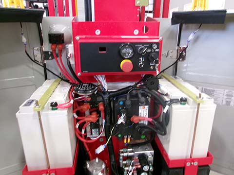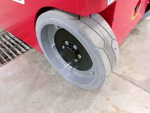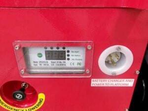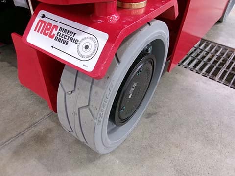 24V DC Electric Motor (Batteries), Non-Marking Tires, 25% Gradeability, Roll-Out Deck Extension, Flashing Beacons, Leak Containment System, 110V AC Power to Platform, 350lbs Lift Capacity, Weighs 3153lbs